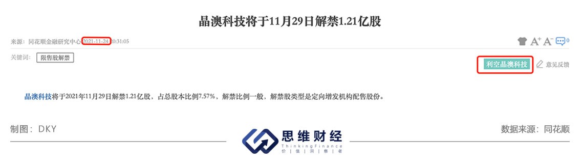 随后的11月24日,晶澳科技发布限售股解禁公告,解除限售公司2019年重大资产重组向宁晋县其昌电子科技有限公司、深圳博源企业管理中心(有限合伙)发行的限售股份,合计解禁限售股数量为1.21亿股,占公司总股本的7.57%。若按11月29日86.44元/股的收盘价计算,晶澳科技本次解禁规模超100亿元。当日,晶澳科技股价最大跌幅达到7.48%,截至收盘跌幅为4.69%,收于89.6元/股。