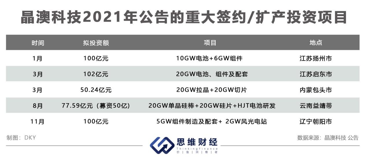 8月23日,晶澳科技发布定增预案,拟募集50亿元,其中32亿元用于曲靖20GW拉晶及切片产能的建设,3亿元用于在扬州新建HJT新技术研发。而后在11月17日,晶澳科技发布公告称,公司拟于辽宁省朝阳市投资建设“晶澳朝阳综合新能源产业基地”,预计总投资额约为100亿元。这是该公司在今年宣布的第三个百亿项目。