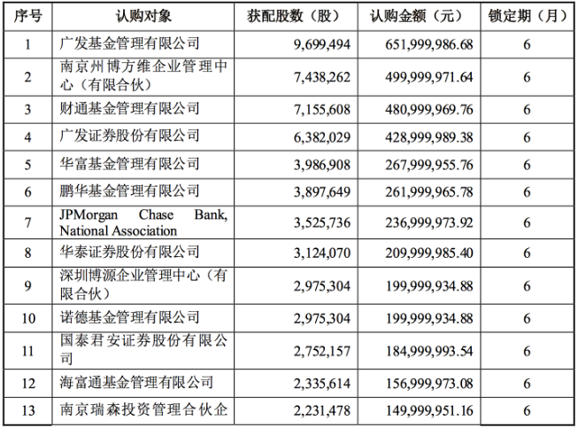 备受关注的是广发基金,其出资6.52亿元参与本次定增,认购了969.95万股股份,成为成功认购股份数量最多的机构。排名第二的是南京州博方维企业管理中心(有限合伙),其出资5亿元认购。财通基金出资4.81亿元认购,排名第三。