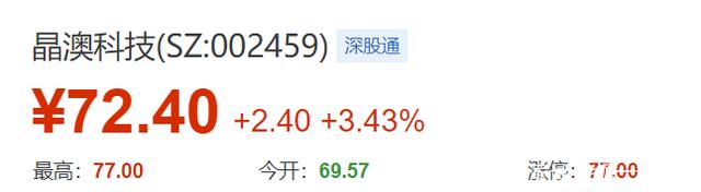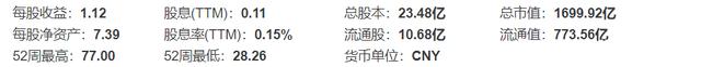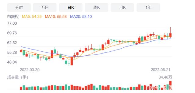 这只个股的最高价达到77元/股,收盘时为72.4元每股,公司的总市值已达1699.92亿,当日成交额高达25.24亿。未来若继续上涨且超过2个涨停板的话,2000亿市值大关将轻而易举地被其突破。