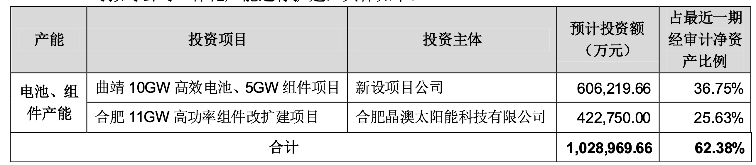 上述定增中晶澳科技对HJT路线的投入,远比不上它近期规划的对TOPCon电池产线的投入。5月18日,晶澳科技发公告称,公司预计投资102.9亿元建设“曲靖10GW高效电池、5GW组件项目”和“合肥11GW高功率组件改扩建项目”。其中,对“曲靖10GW高效电池、5GW组件项目”的投资额为60.62亿元。