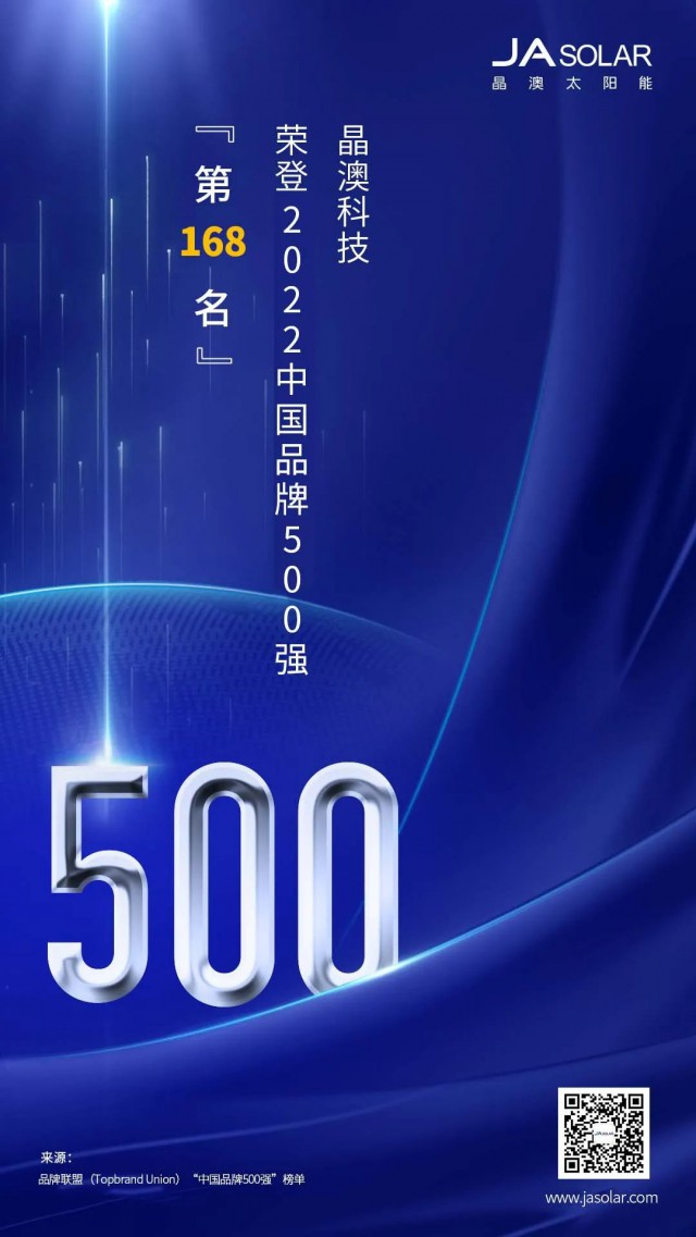 近日,第十六届中国品牌节年会在长沙举行。主办方品牌联盟(Topbrand Union)在开幕式上发布了“2022中国品牌500强”榜单,晶澳科技荣登榜单第168位,较去年上升101位。