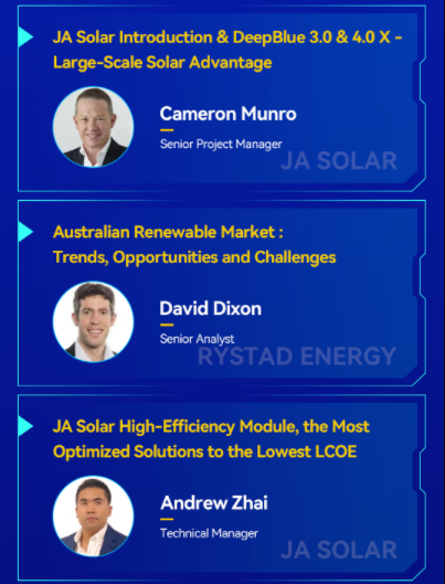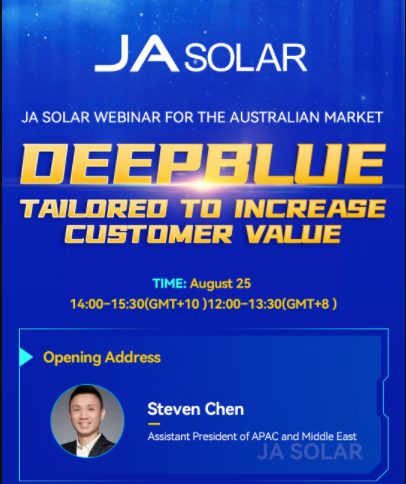 8月25日(明天),晶澳将以“DeepBlue, Tailored to Increase Customer Value"为主题,举办线上研讨会。届时,晶澳将与来自逆变器厂商、分析机构和认证机构的专家为全球观众分享最新的光伏技术、产品和澳大利亚市场趋势。诚邀您届时上线观看。
