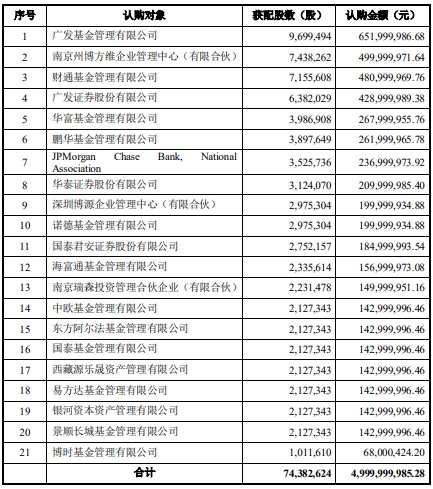本次非公开发行的发行对象为广发基金管理有限公司、南京州博方维企业管理中心(有限合伙)、财通基金管理有限公司、广发证券股份有限公司、华富基金管理有限公司、鹏华基金管理有限公司、JPMorgan Chase Bank,National Association、华泰证券股份有限公司、深圳博源企业管理中心(有限合伙)、诺德基金管理有限公司、国泰君安证券股份有限公司、海富通基金管理有限公司、南京瑞森投资管理合伙企业(有限合伙)、中欧基金管理有限公司、东方阿尔法基金管理有限公司、国泰基金管理有限公司、西藏源乐晟资产管理有限公司、易方达基金管理有限公司、银河资本资产管理有限公司、景顺长城基金管理有限公司、博时基金管理有限公司。本次非公开发行的发行对象共21名,发行对象认购的股票限售期为新增股份上市之日起6个月。