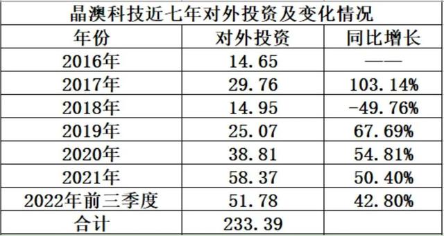 据黑鹰光伏统计,近7年间(2016年-2022年前三季度)晶澳科技合计对外投资233.39亿元,已连续4年保持增长势头。