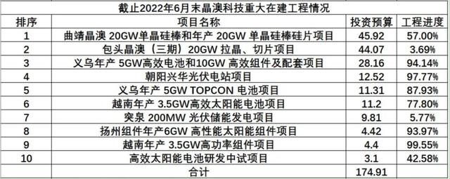 而据财报披露,晶澳科技很多重大在建工程都已进入执行/收官阶段。如下表所示,截止2022年6月末,晶澳科技有10个重大在建工程,总投资预算合计为174.91亿元,其中7个项目工程进度超50%,4大项目工程进度超90%。