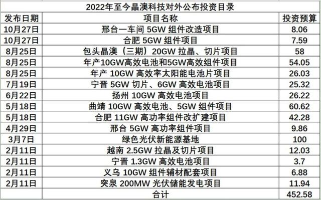 笔者注意到,2022年晶澳科技进击势头变的更加突出。仅2022年至今其就对外公布了15个重大投资计划,总投资合计高达452.58亿元,投资领域涵盖拉晶、切片、电池、组件、光伏电站等全产业链。