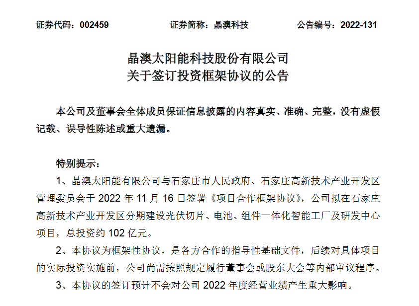 11月16日,晶澳科技全资子公司晶澳太阳能与石家庄政府签署《项目合作框架协议》,拟在石家庄高新技术产业开发区分期建设光伏切片、电池、组件一体化智能工厂及研发中心项目,总投资约102亿元。