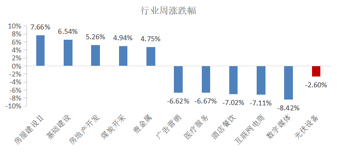 上周(2022/12/21-2022/12/25),光伏设备行业下跌2.6%,沪深300下跌0.68%,光伏设备行业跑输大盘1.92pct。从全行业看,涨幅前五行业分别是房屋建设Ⅱ(7.66%)、基础建设(6.54%)、房地产开发(5.26%)、煤炭开采(4.94%)和贵金属(4.75%)。