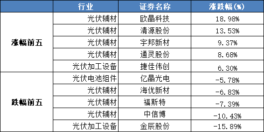 上周光伏行业中涨幅前五的公司有欧晶科技(18.98%)、清源股份(13.53%)、宇邦新材(9.37%)、通灵股份(8.68%)和捷佳伟创(6.3%);跌幅前五的公司分别是亿晶光电(-5.78%)、海优新材(-6.83%)、福斯特(-7.39%)、中信博(-10.43%)和金辰股份(-15.89%)。