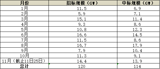 截止11月25日,今年光伏EPC累计招标120GW,累计中标规模114GW。(2021年国内光伏装机规模为54.88GW)