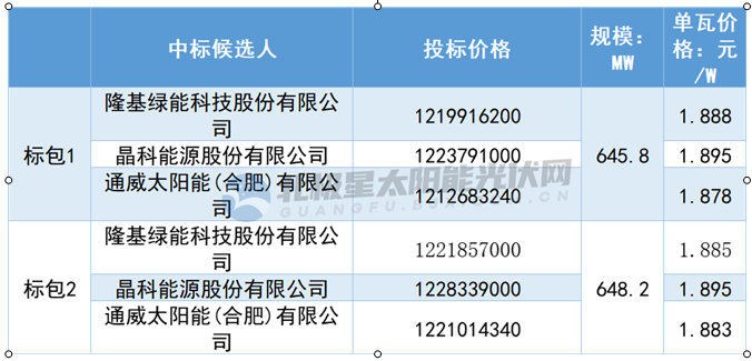 近日,华能新疆公司乌什700兆瓦光储一体化项目、兵团第二师300兆瓦光伏项目光伏组件设备预招标中标候选人公示。隆基、晶科、通威位列1、2标段中标候选人,最高价格为1.895元/W,最低价格为1.878元/W。(北极星太阳能光伏网)