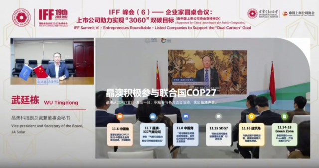 12月4日,国际金融论坛(IFF)第19届全球年会企业家圆桌会议召开,与会嘉宾围绕“上市公司助力实现‘3060’双碳目标”主题展开深入讨论与交流。晶澳科技副总裁兼董事会秘书武廷栋出席并发表主旨演讲。
