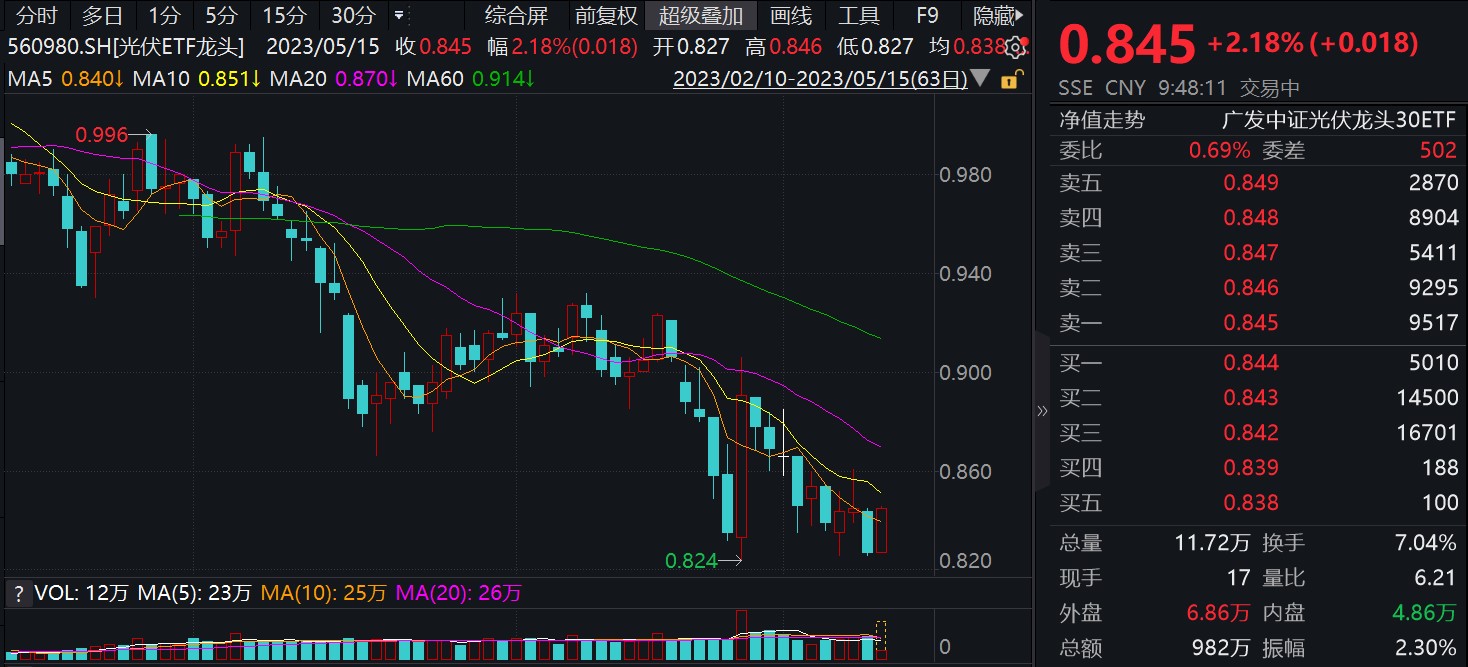 截至9:48分,光伏ETF龙头(560980)今日开盘持续上涨现达2.18%,成交额持续放大,换手率已达7.04%,盘中交投活跃。