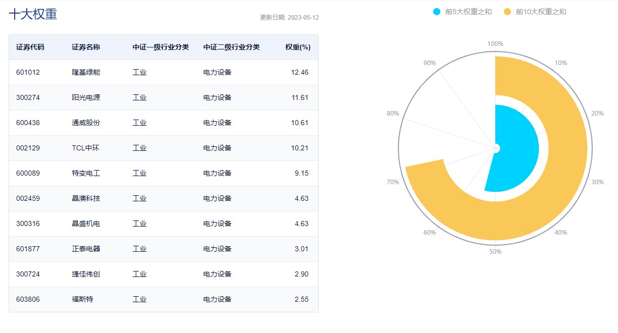 数据显示,截至2023年5月12日,该指数前十大权重股包括隆基绿能、阳光电源、通威股份、TCL中环、特变电工等,前十大之和为71.76%。