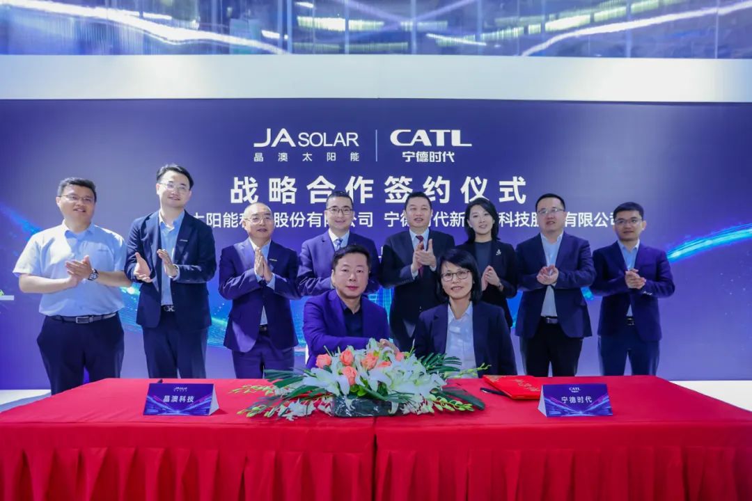 5月24日,宁德时代新能源科技股份有限公司(简称“宁德时代”)与晶澳太阳能科技股份有限公司(简称“晶澳科技”)在上海SNEC展会期间签订战略合作协议。宁德时代储能事业部执行总裁肖丽娜、晶澳科技助理总裁施俊代表双方签署协议。宁德时代首席客户官、市场体系联席总裁谭立斌,储能事业部总裁助理李晓熙,晶澳科技轮值总裁杨爱青,高级副总裁孙广彬见证签约。