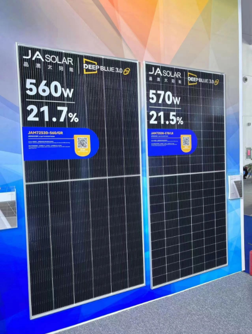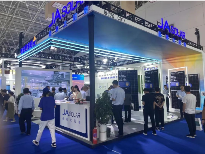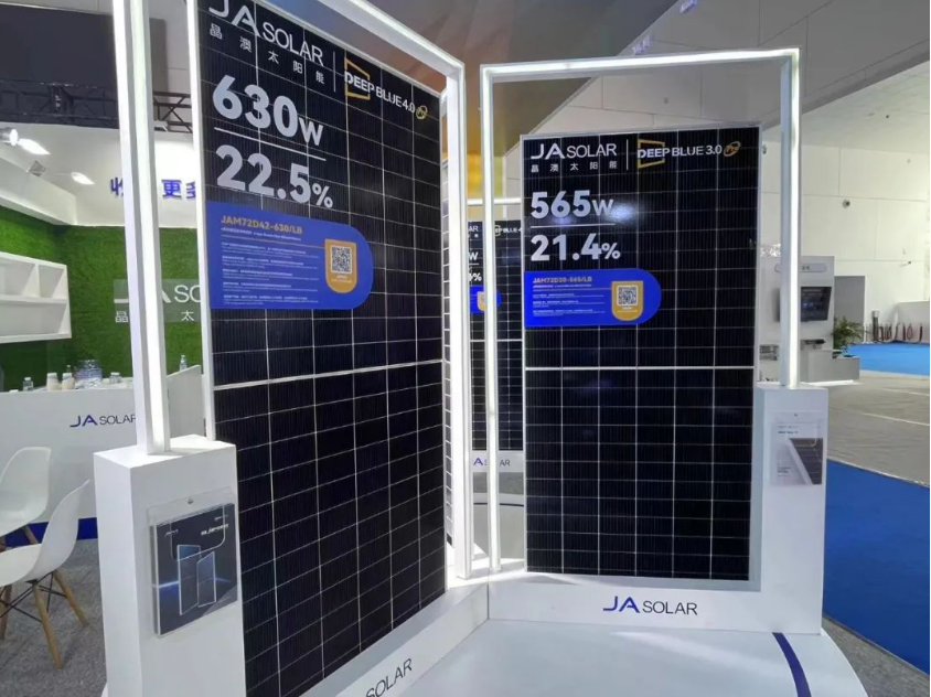 在本次展会中,晶澳科技展出了DeepBlue 4.0 Pro和DeepBlue 3.0 Pro系列展品。DeepBlue 4.0 Pro是晶澳科技新推出的高效n型组件产品,采用晶澳科技自主研发的高效n型钝化接触Bycium+电池技术,结合产业链和行业包容性更强的182mm*199mm矩形硅片,电池开路电压(Voc)高达725mV,量产转换效率可达25.3%。同时,该系列产品还集成了SMBB、高密度封装等提质增效技术,72版型组件功率可达630W,组件效率超22.5%。该系列组件尺寸包含2465mm、1762mm等四款市场主流版型,可以适应住宅屋顶、工商业屋顶和大型地面电站等不同应用场景的需求。