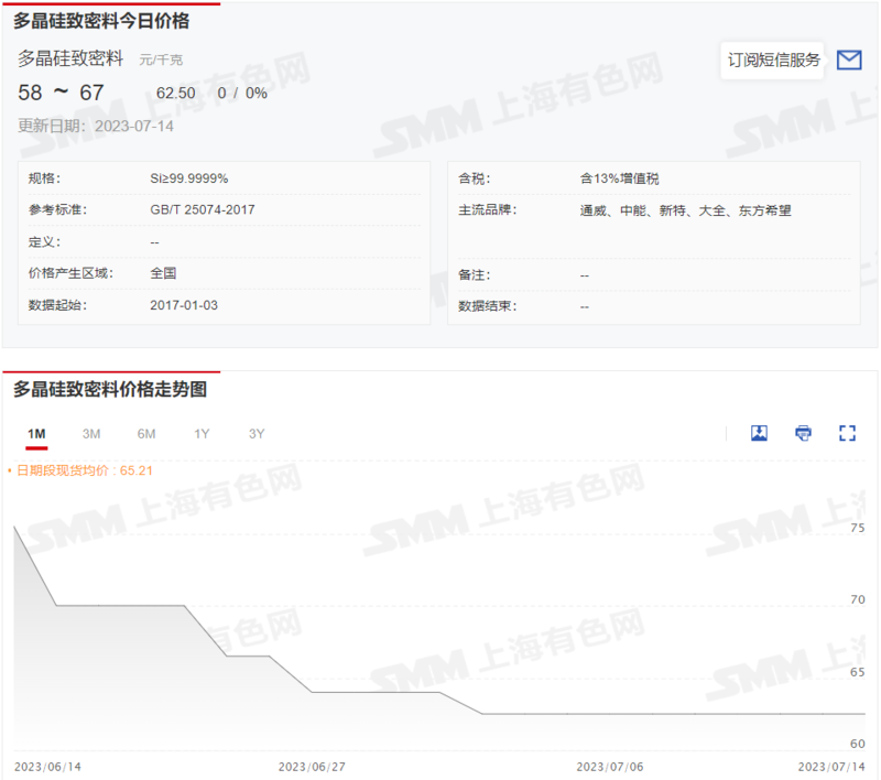 而上游原材料方面,SMM现货报价显示,多晶硅致密料现货价格近期已经连续多日维稳,处于58~67元/千克的价位,均价报62.5元/千克。