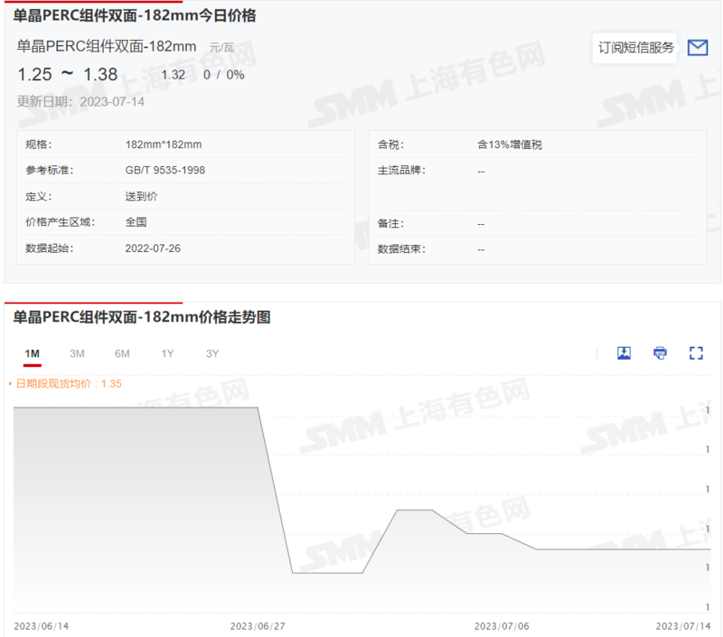 组件方面,据SMM现货报价显示,截止7月14日,单晶PERC组件双面-182mm现货报价在1.25~1.38元/瓦,均价报1.32元/瓦。
