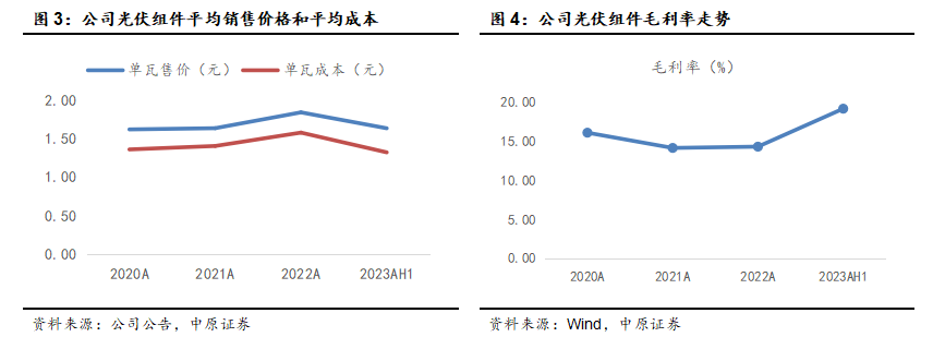 光伏组件出货增长和单位盈利提升推动公司业绩高增。2023年上半年,公司营业收入和归母净利润均实现较大幅度的增长,主要得益于全球旺盛的装机需求、公司在海外市场的大力开拓、新增产能投放以及公司优秀的供应链管理能力。进而公司上半年实现光伏组件的销量增长和单瓦盈利的提升。具体来看,上半年,公司光伏组件出货量23.95GW(含自用497MW),同比增长52.84%。其中,海外组件出货占比55%,分销占比34%。经计算,上半年,公司光伏组件平均销售价格1.64元/瓦,平均生产成本1.32元/瓦,单瓦毛利0.31元,保持良好盈利水准。公司销售毛利率19.35%,同比提升6.14个百分点,销售净利率12.26%,同比提升6.06个百分点。公司资产减值、信用减值损失和资产处置收益为-1.18亿元、-0.73亿元和-0.67亿元。