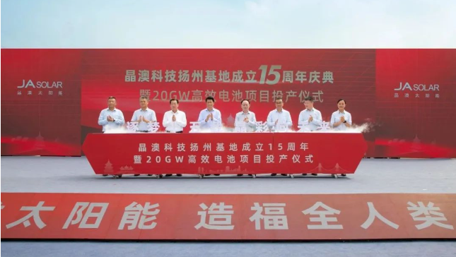 9月26日上午,晶澳科技扬州基地成立15周年庆典暨20GW高效电池项目投产仪式在扬举行。