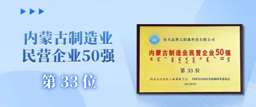 会上发布了“2023内蒙古民营企业100强”、“2023内蒙古制造业民营企业50强”等榜单和调研分析报告。作为内蒙古地区光伏行业的龙头企业,晶澳科技包头基地位列“内蒙古民营企业100强”第54位、“内蒙古制造业民营企业50强”第33位,较上年分别上升4位。