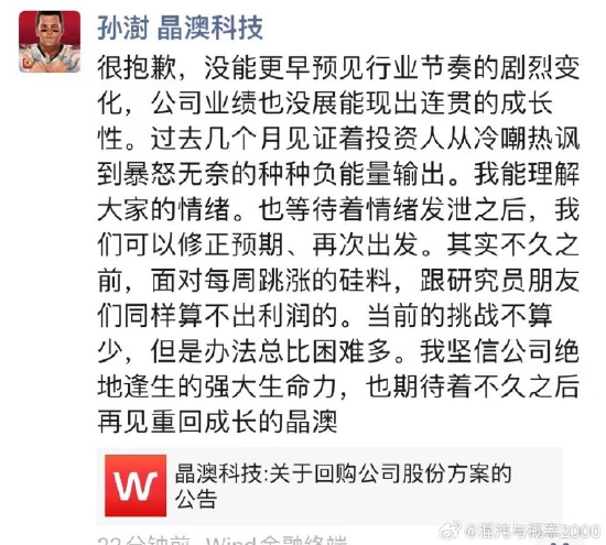 10月31日消息,网传刚刚宣布回购股份的光伏组件龙头晶澳科技一位高管在其个人社交媒体致歉,其中提到几个中心点。