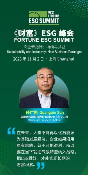 晶澳科技高级副总裁孙广彬应邀出席,围绕“前沿技术勾勒的可持续未来”议题,分享了晶澳在ESG领域的实践经验。他表示“在未来,人类不能再以化石能源为基础发展经济。企业如果沿用原有思路,就不可能盈利,所以要在当下就把气候转型纳入战略,把ESG做好,才能实现长期的财富积累。”