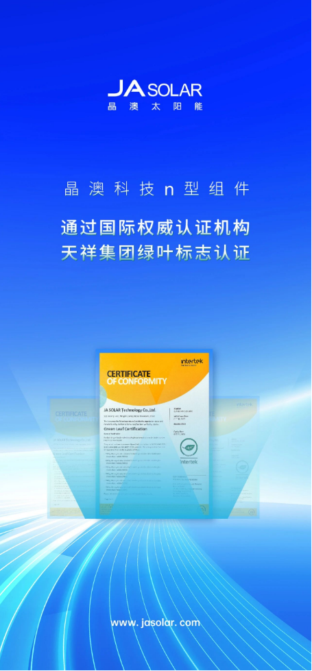 近日,晶澳科技n型组件通过国际权威认证机构天祥集团绿叶标志认证,这是对晶澳科技在可持续发展方面所作的切实努力的又一重要认可,彰显了晶澳科技在光伏行业的品牌影响力和市场认可度。