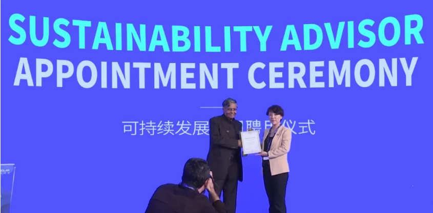 在该活动上,晶澳科技聘请了首位可持续发展顾问Mohan Munasinghe教授(IPCC联合国政府间气候变化委员会前副主席)。并由晶澳科技董事、助理总裁靳军辉为其授予顾问证书。