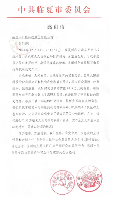 近日,晶澳科技收到中共临夏市委员会、临夏市人民政府发来的感谢信。信中对晶澳科技在甘肃省临夏回族自治州积石山县发生地震后,第一时间捐献抗震物资解决受灾群众基本生活困难,展现高度的社会责任担当和无私奉献精神表示衷心感谢。
