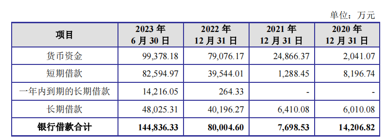 数据显示,2020年祥邦科技银行借款仅有1.42亿元,截止2023年6月30日,公司有息负债超过14.48亿元,3年半时间内公司银行借款增长超10倍。