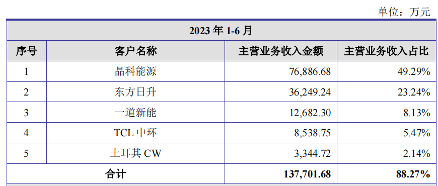 此后三年,祥邦科技对晶科能源的销售金额持续增长。到2023年上半年,晶科能源对祥邦科技采购力度再度加大,销售金额达7.69亿元,销售占比进一步提升至49.29%。