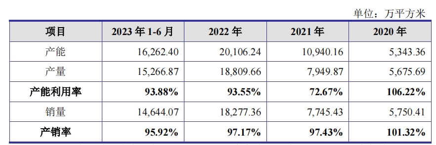 数据显示,2020年祥邦科技产能利用率高达106.22%,到2023年上半年下滑至93.88%,同期,产销率也出现下滑。