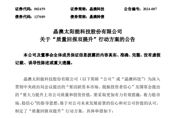 近日,晶澳科技发布“质量回报双提升”行动方案的公告,涉及主业发展、研发创新、数智化建设、投资者回报、信息披露等多方面的内容。