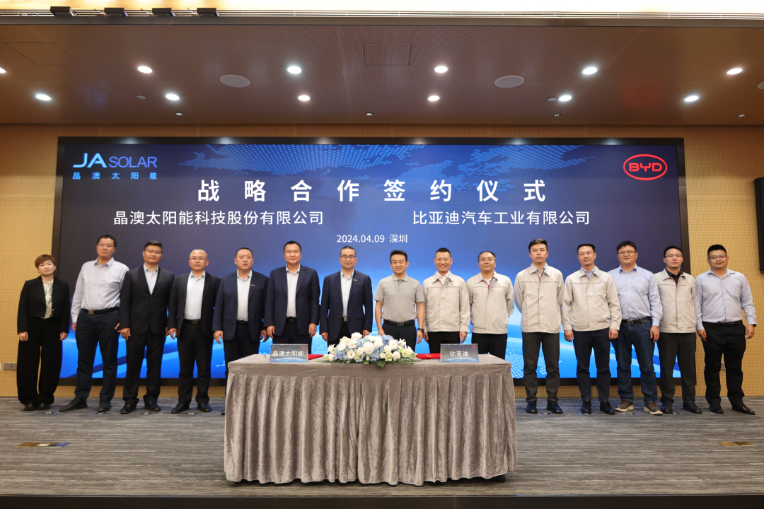 4月9日,晶澳太阳能科技股份有限公司(简称“晶澳科技”)与比亚迪汽车工业有限公司(简称“比亚迪”)在深圳比亚迪总部举行战略合作签约仪式。晶澳科技副总裁、智慧能源事业部总经理李栋,比亚迪储能及新型电池事业部副总经理张金龙代表双方签署协议。晶澳科技执行总裁杨爱青、助理总裁张凤海,比亚迪储能及新型电池事业部总经理尹小强、产品总监姜锋等见证签约。