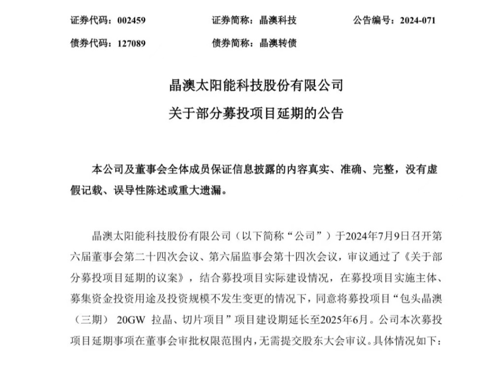 存货高但价格低,贬值下的晶澳科技不得不通过放缓扩建进程“断臂求生”。近日,晶澳科技宣布将2023年可转债募投项目中的“包头晶澳(三期)20GW拉晶、切片项目”建设期延长一年至2025年6月。截至2024年6月末,上述包头项目累计已投入募集资金22.82亿元,投资进度为84.5%。