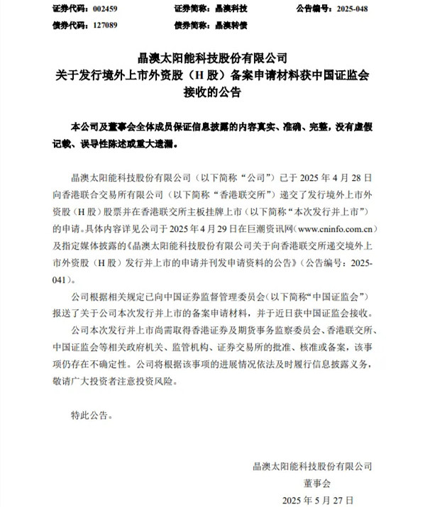 5月26日,晶澳科技(002459)公告称,公司已于2025年4月28日向香港联合交易所有限公司(以下简称“香港联交所”)递交了发行境外上市外资股(H股)股票并在香港联交所主板挂牌上市的申请。