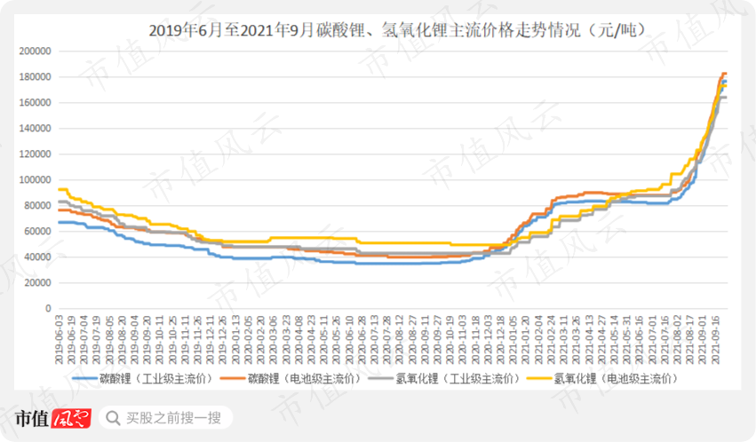 锂精矿的持续跳涨直接推动碳酸锂、氢氧化锂价格的上涨,9月底国产电池级碳酸锂、电池级氢氧化锂最新报价分别达18.3万元/吨、17.5万元/吨,2021年三季度末环比二季度末涨幅分别达110%、90%。