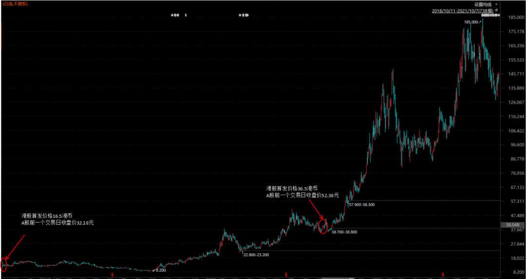 2018年10月10日的港股首发价格仅仅16.5港币,彼时A股的价格均在27块以上,就是港股首发的前一个交易日的收盘价为人民币32.10元。也就是说,港股首发价格不到A股的一半。