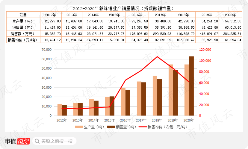 年度报告披露数据显示,2012年折算为碳酸锂当量的产量为1.23万吨,当期的销售量为1.15万吨;随后产能持续释放,到2019年是折算为碳酸锂当量的产量规模达5.4万吨,增长增加了3.4倍。