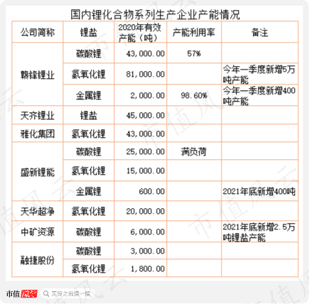 截止2021年6月底,已形成年产电池级碳酸锂4.3万吨、电池级氢氧化锂8.1万吨(其中5万吨2020年末新增产能,今年一季度已达到满产状态)、金属锂2000吨的产能;