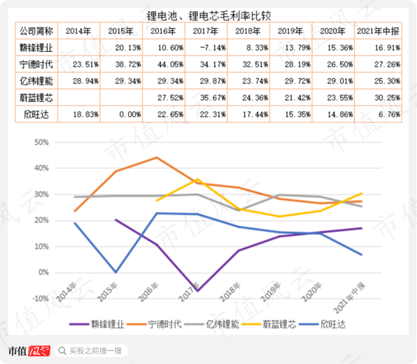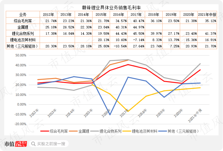 目前市值高达2300亿元的赣锋锂业,其毛利率表现与在二级市场被热捧相比,暗淡许多,2012至2020年多数年份综合毛利率在20%至35%之间,而碳酸锂价格较高的2018年综合毛利率也只有36%。