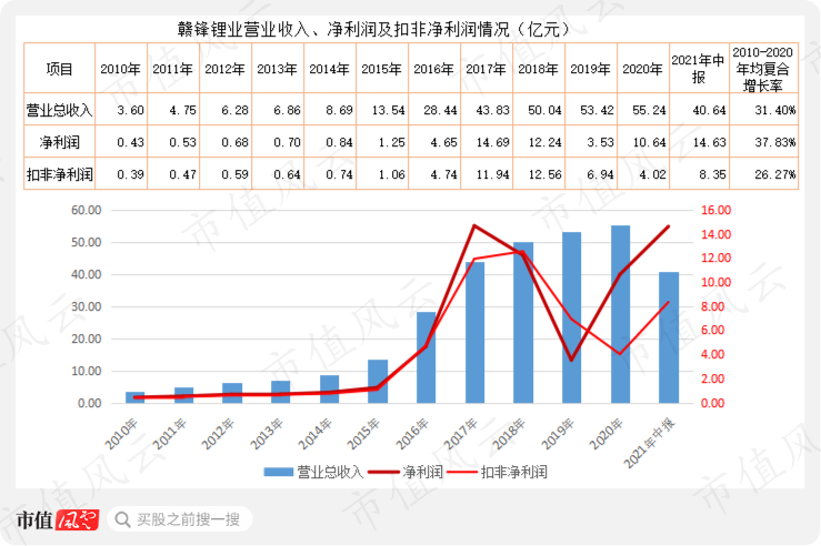 赣锋锂业的收入规模自上市以来逐年增长,2010年至2020年的年均复合增长率达31.4%,净利润则接近38%,扣非净利润低一些,为26%。