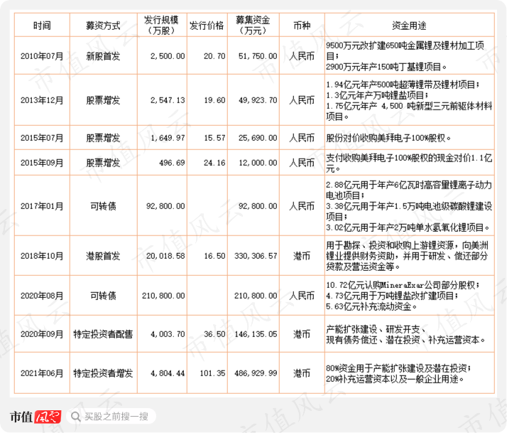 自上市以来,赣锋锂业通过A股和H股累计募资超127亿元(港币依据当期汇率换算为人民币),其中,2020年至今累计融资额达84亿元(含债转股融资),占总融资额的2/3,显然在为继续放大招储备“弹药”。