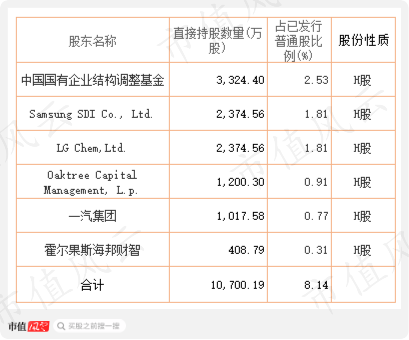 根据其披露的股东信息,中国国有企业结构调整基金、一汽股权投资(天津)有限公司、霍尔果斯海邦财智、SamsungSDICo.,Ltd(三星集团旗下能源公司)、LGChem,Ltd、OaktreeCapitalManagement,L.p.(美国橡树资本)等机构。