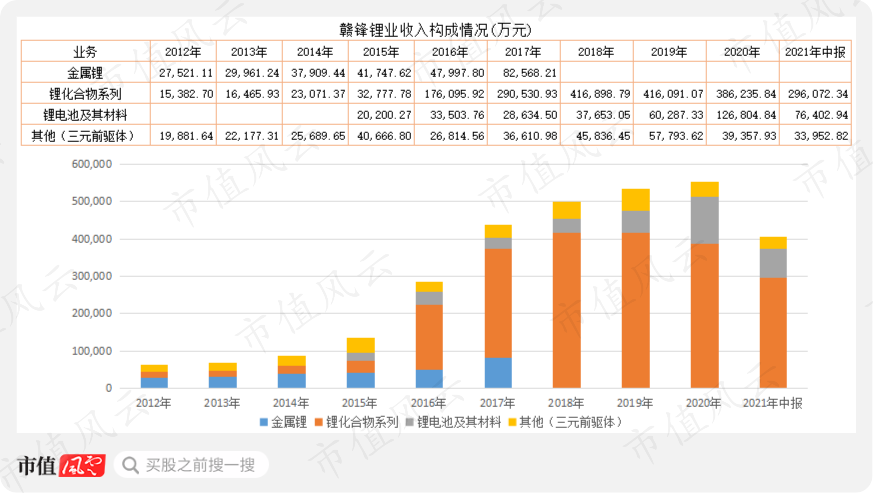 2016年以来,锂化合物系列产品为上市公司主要收入来源;2018年后,金属锂的销售停了,转向锂化合物系列的业务。