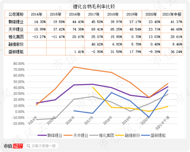 长期来看,5家公司中赣锋锂业的锂化合物毛利率低于天齐锂业,但高于另外3家公司。从2021年中报来看,赣锋锂业与天齐锂业的毛利率差距在缩小,似乎天齐锂业资源禀赋优势正在消失。