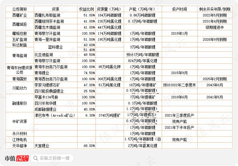 截止2020年底,国内有20多家自有或包销锂矿资源的企业。