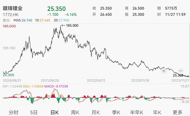 值得注意的是,赣锋锂业在上述个股中跌幅最大,且在今日早盘一度跌至25.3港元,创下自2020年9月11日以来的盘中新低。